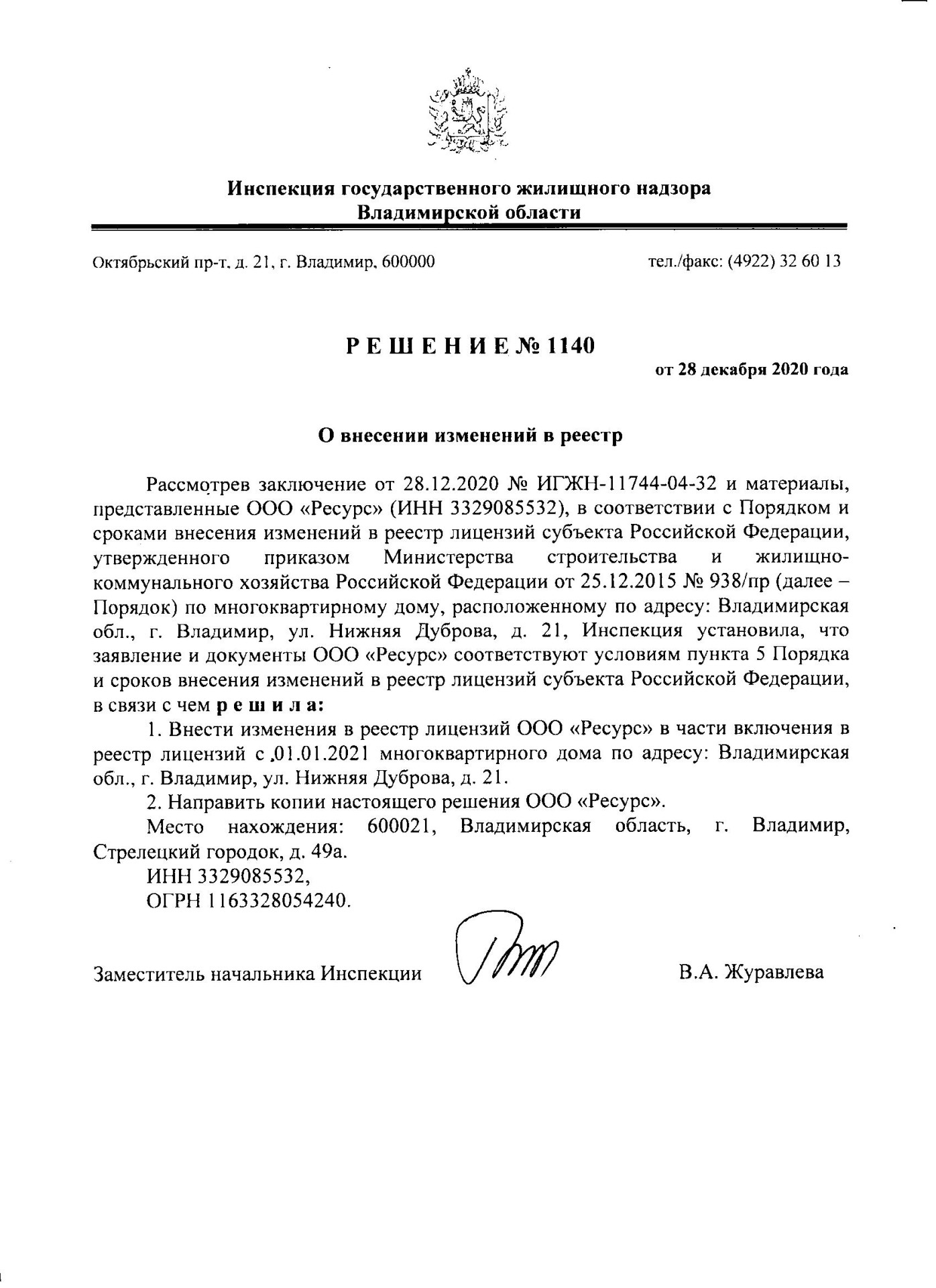 600037, Владимирская обл, г. Владимир, ул. Нижняя Дуброва, д. 21